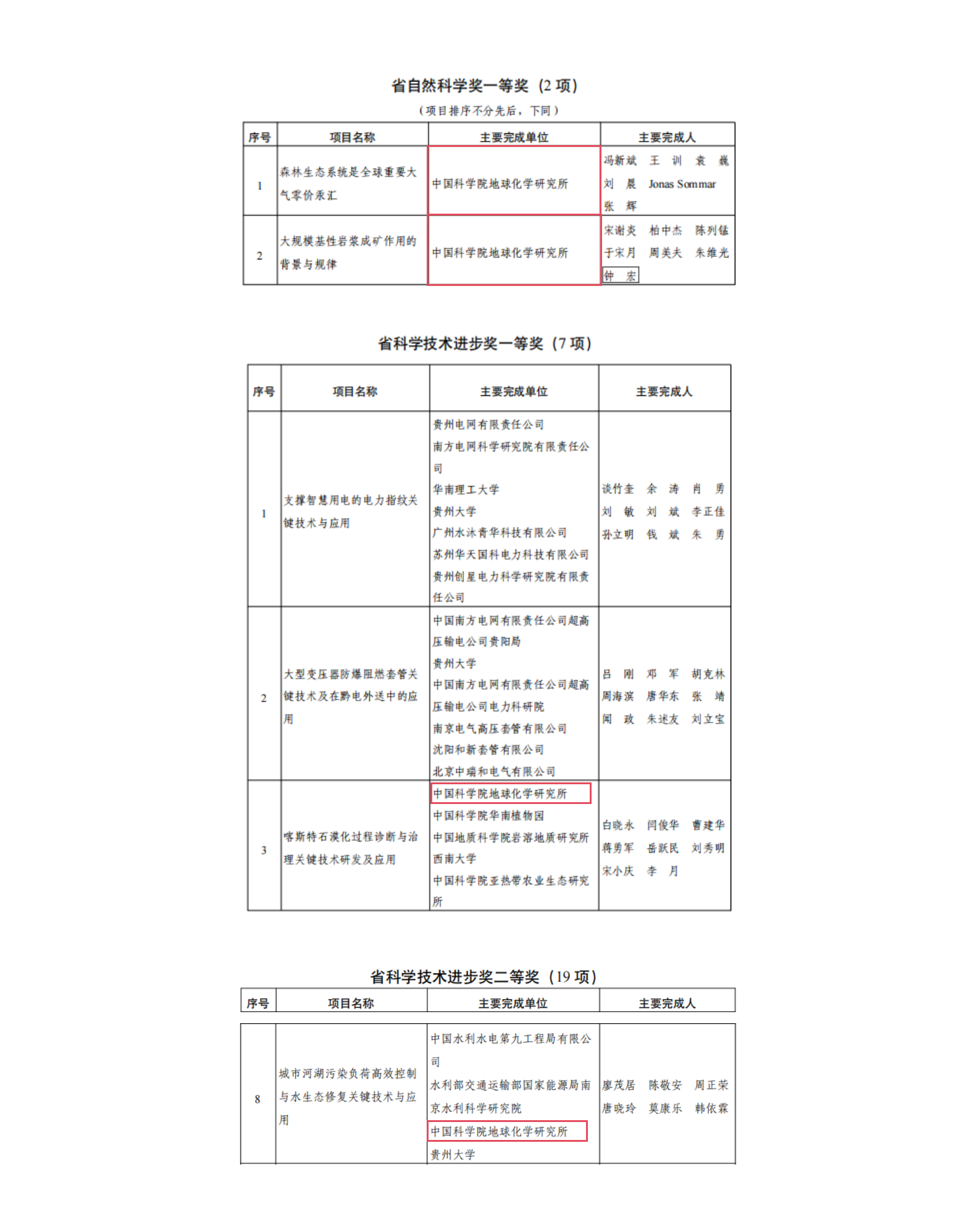 近日,贵州省人民政府下发了《省人民政府关于2024年度贵州省科学技术奖励的决定》,共授予:省最高科学技术奖(1项)、省自然科学奖一等奖(2项)、省自然科学奖二等奖(10项)、省自然科学奖三等奖(27项)、省技术发明奖一等奖(2项)、省科学技术进步奖一等奖(7项)、省科学技术进步奖二等奖(19项)、省科学技术进步奖三等奖(52项)、省科学技术合作奖(1项)。