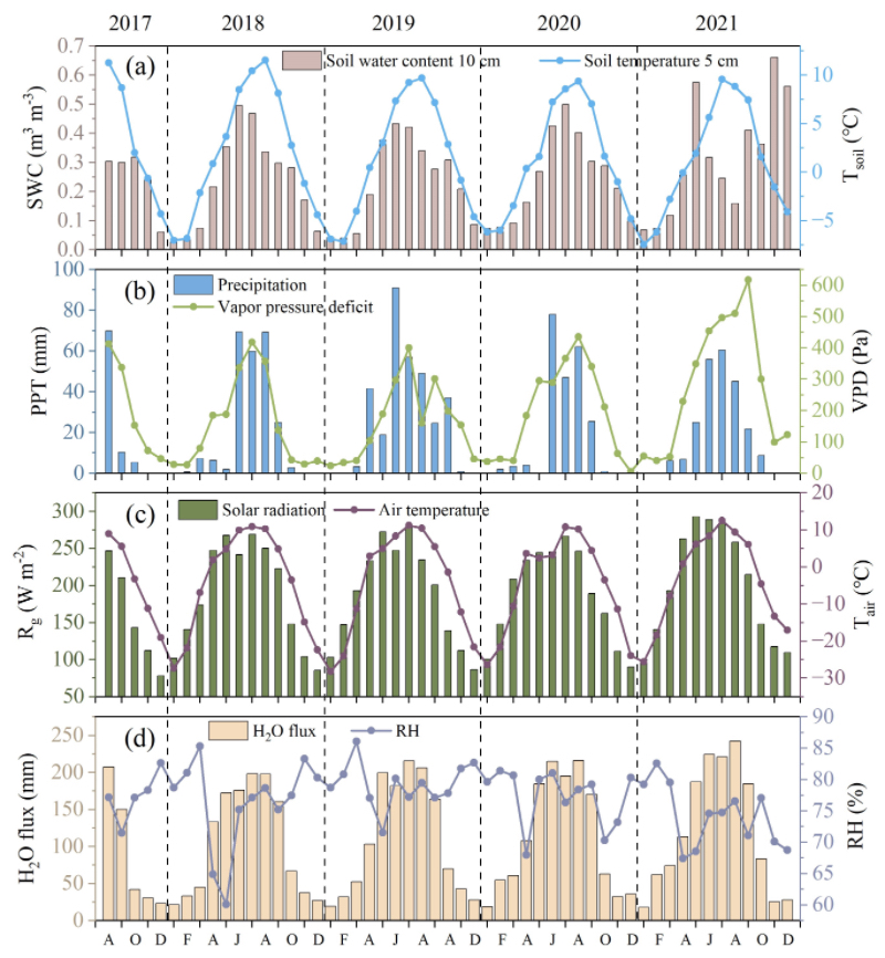 在全球气候变化背景下,干旱与半干旱生态系统的水循环和碳循环过程日益引起学术界的关注。近日,中国科学院地球化学研究所环境地球化学国家重点实验室洪冰研究员课题组,通过对我国新疆巴音布鲁克草原生态系统的长期连续观测与实验模拟研究(图1),揭示了该地区水汽通量、碳通量及生态系统呼吸对气候变化的响应机制,为理解全球变化下的生态反馈提供了重要科学依据。